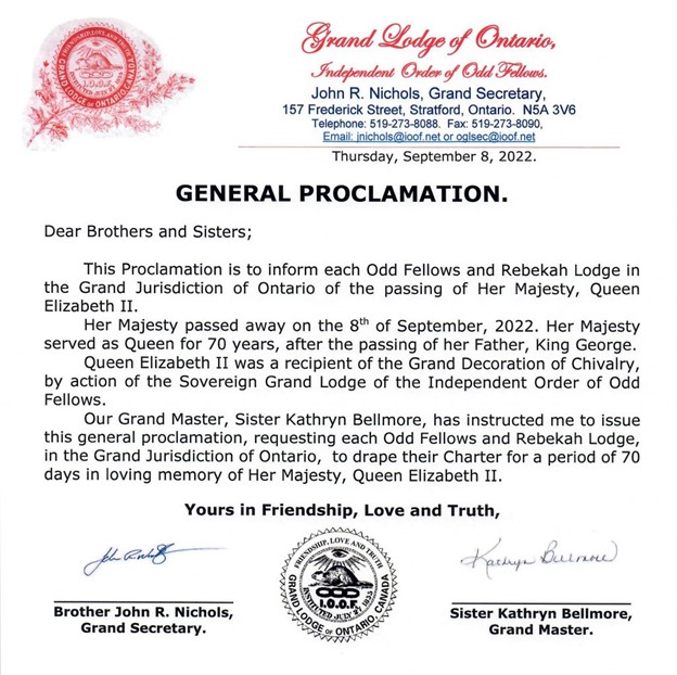 Please read out the attached Proclamation and drape your Lodge Charter for a period of 70 days in commemoration of Her Majesty’s 70 years on the Throne.