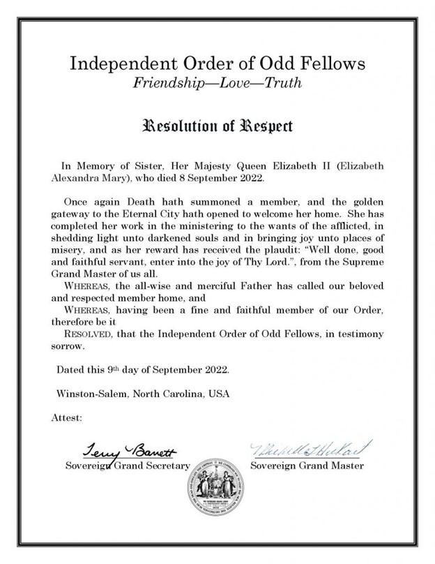 Her Majesty was granted the Grand Decoration of Chivalry by action of the Sovereign Grand Lodge of the Independent Order of Odd Fellows.