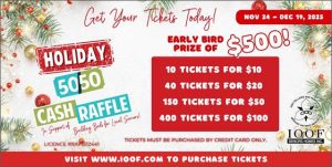 Purchase tickets for the <www.rafflebox.ca/raffle/ioof> Holiday 50/50 Raffle from November 24th to December 19th, 2025. Buy your tickets before the deadline for the Early Bird draw for a chance to win $500 on Friday, December 5th, 2025. Grand prize draw will be on Friday, December 19th, 2025.